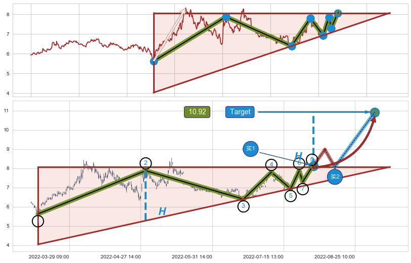 ➣ 最小中继整理涨幅→𝐇: 2.791 (上侧直角边第一阻力点②与斜边垂直距离)