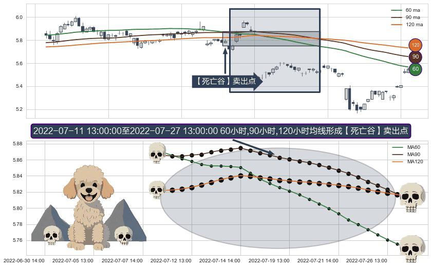 形态多维评估: ⚀ 2022-07-11 14:00:00-小时至2022-07-27 13:00:00-小时显现 60小时-90小时-120小时均线 【死亡谷】卖出点 看空信号,后市看跌,卖出