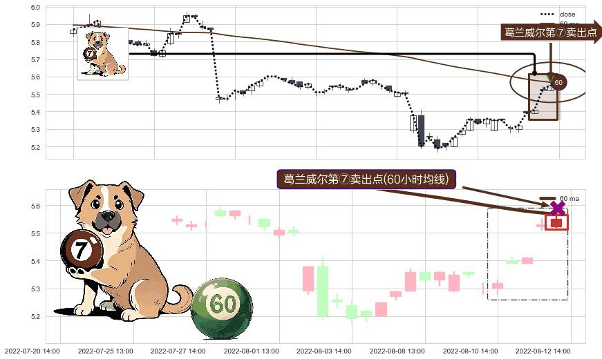 形态多维评估: ⚀ 2022-08-12 14:00:00-小时显现 葛兰威尔均线 60小时均线 第⑦卖出点 下降趋势的中继信号,后市看跌,卖出信号