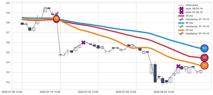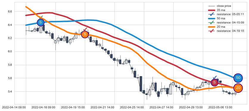 下跌趋势04-14 09:00-05-06 14:00,均线50, 35, 20确认关键阻力3处