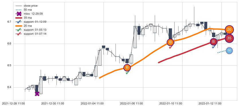上涨趋势12-28 11:00-01-12 13:00,均线35, 20确认关键支撑3处