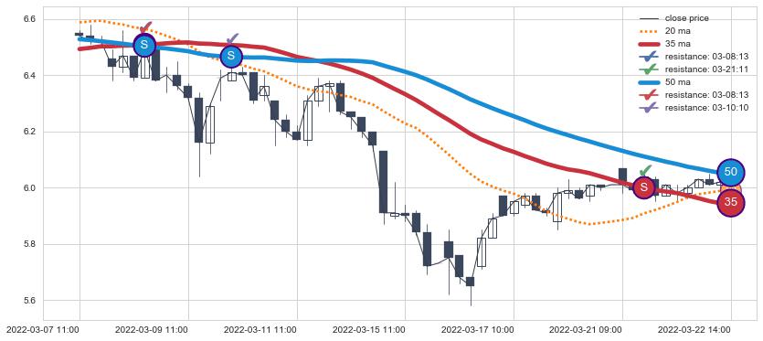 下跌趋势03-07 11:00-03-22 14:00,均线50, 35确认关键阻力3处