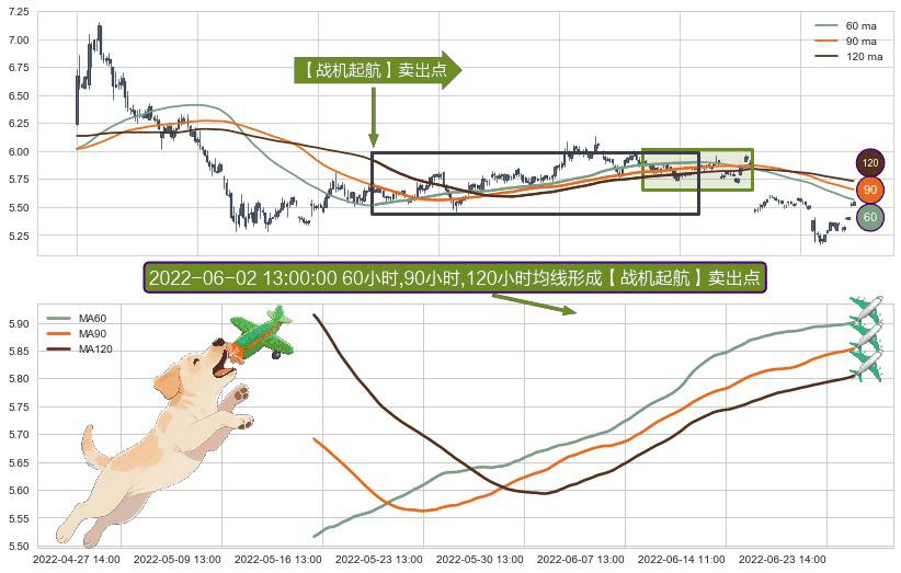 形态多维评估: ⚀ 2022-05-16 10:00:00小时-2022-06-29 13:00:00小时显现 60小时-90小时-120小时均线 【战机起航】卖出点 看空信号,后市看跌,卖出