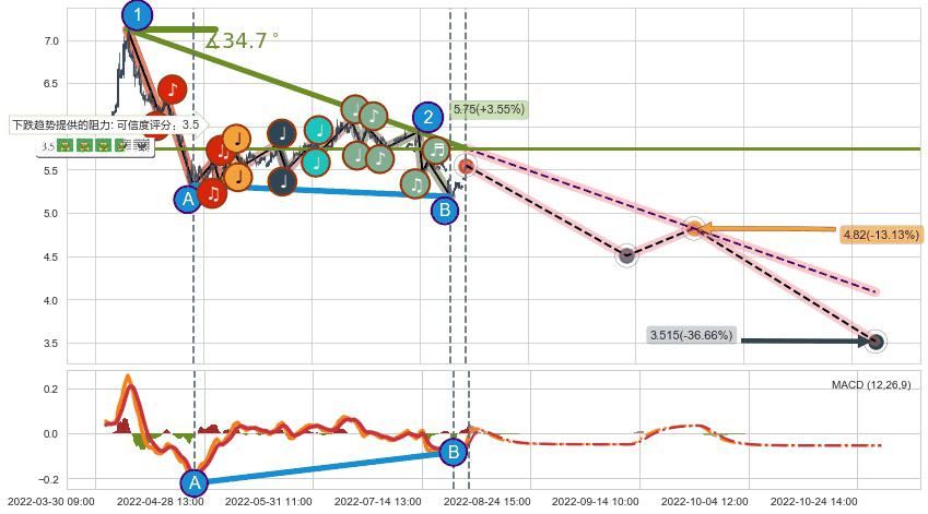 ♘ 阻力价格位5.73,可信任强度60.10%,距离最后交易2022-08-12 14:00形成的收盘价格5.55相差 +3.16%