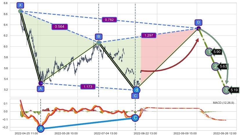 ➣ D点拟合预测价格6.33,距离最后交易收盘价格5.55相差 +14.09%
