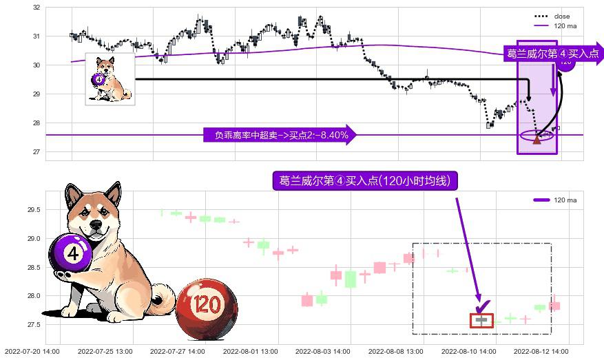 ⚀ 2022-08-10 13:00:00-小时显现 葛兰威尔均线 120小时均线 第④买入点 下降趋势均值回复的短线反弹信号,后市看涨,买进信号