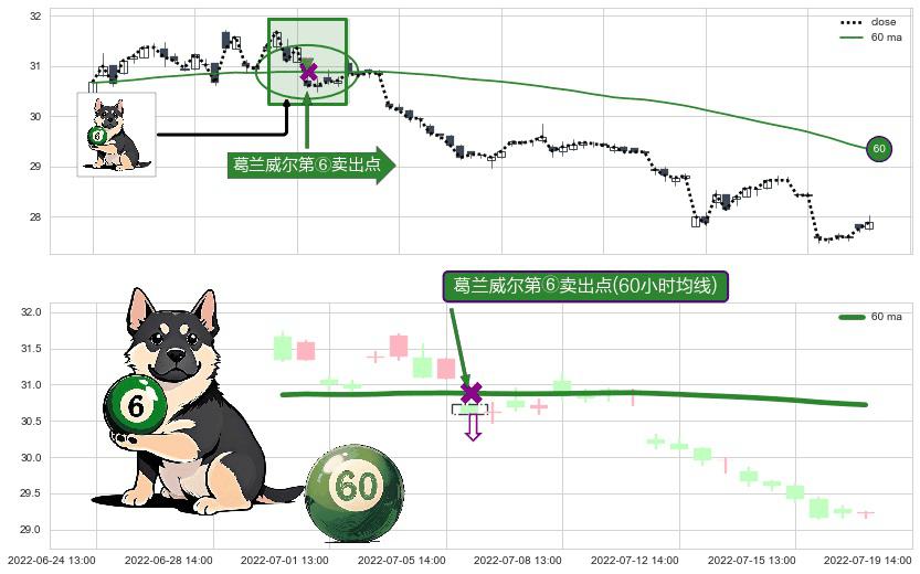 ⚀ 2022-07-06 13:00:00-小时显现 葛兰威尔均线 60小时均线 第⑥卖出点 走势反转见顶信号,后市看跌,卖出信号