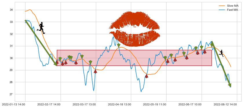 ⚅ 卖点向下突破均线后,价格走势有持续向下的迹象,但动能稍显不足,迟迟不能远离均线