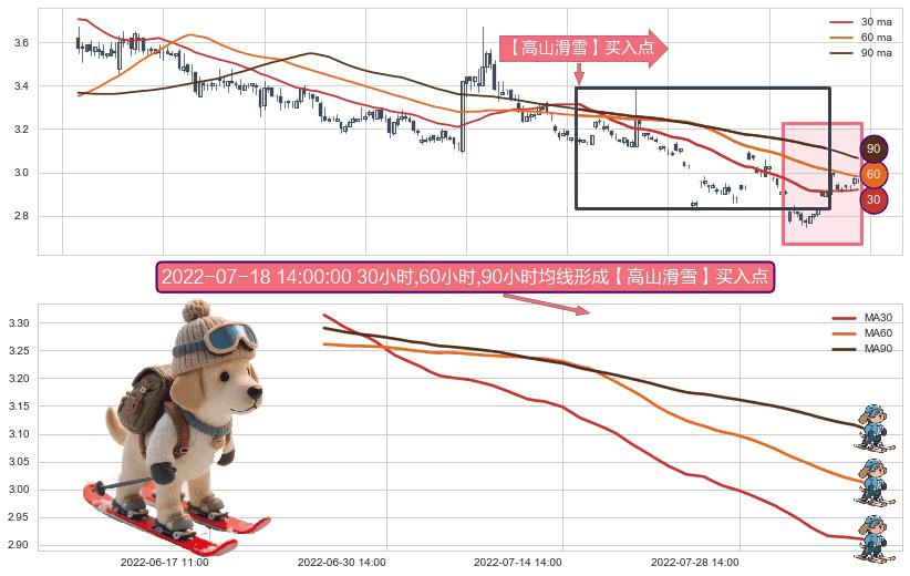 ⚀ 2022-06-27 13:00:00小时-2022-08-08 14:00:00小时显现 30小时-60小时-90小时均线 【高山滑雪】买入点 看多信号,后市看涨,买入
