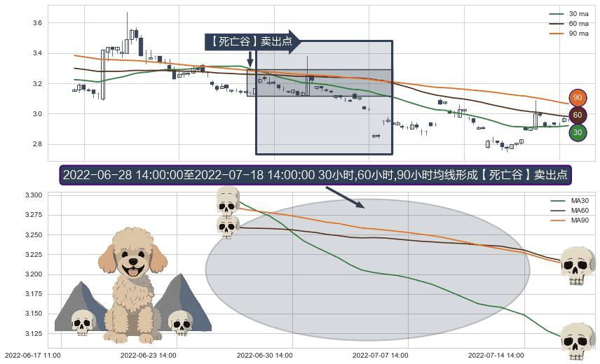 ⚀ 2022-06-29 13:00:00-小时至2022-07-18 14:00:00-小时显现 30小时-60小时-90小时均线 【死亡谷】卖出点 看空信号,后市看跌,卖出