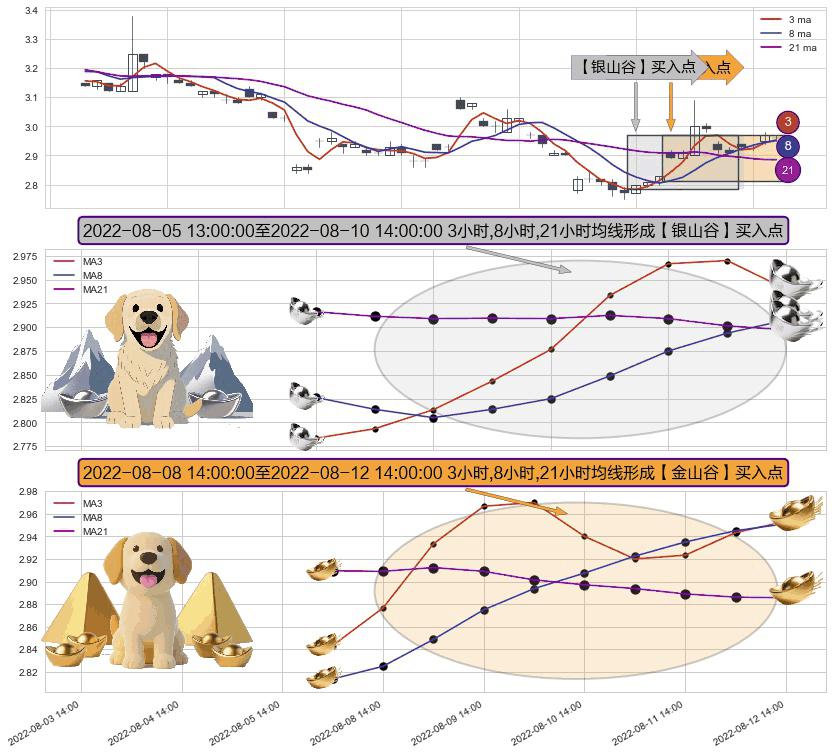⚀ 2022-08-09 13:00:00-小时至2022-08-12 14:00:00-小时显现 3小时-8小时-21小时均线 【金山谷】买入点 其再次确认了买入信号,可靠性更强,买入