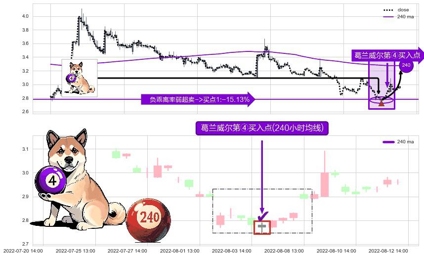 ⚀ 2022-08-04 13:00:00-小时显现 葛兰威尔均线 240小时均线 第④买入点 下降趋势均值回复的短线反弹信号,后市看涨,买进信号
