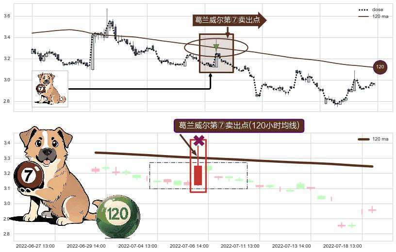 ⚀ 2022-07-06 13:00:00-小时显现 葛兰威尔均线 120小时均线 第⑦卖出点 下降趋势的中继信号,后市看跌,卖出信号