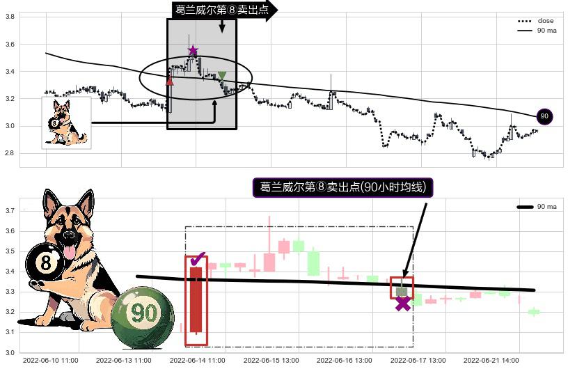 ⚀ 2022-06-17 09:00:00-小时显现 葛兰威尔均线 90小时均线 第⑧卖出点 下降趋势的中继信号,后市看跌,卖出信号