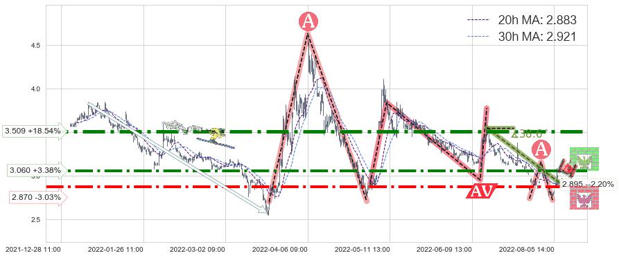 🦴 长线均值回复组合短线趋势跟踪[强阻力信号]2022-06-15 11:00-2022-08-12 14:00下跌趋势依然成立(下跌趋势跟踪依然存在),短线价格略微上行反弹(均值回复猜想),即将接近下跌趋势提供的未破位阻力价格:2.895。