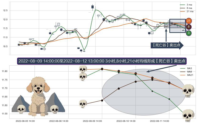 ⚀ 2022-08-10 13:00:00-小时至2022-08-12 13:00:00-小时显现 3小时-8小时-21小时均线 【死亡谷】卖出点 看空信号,后市看跌,卖出