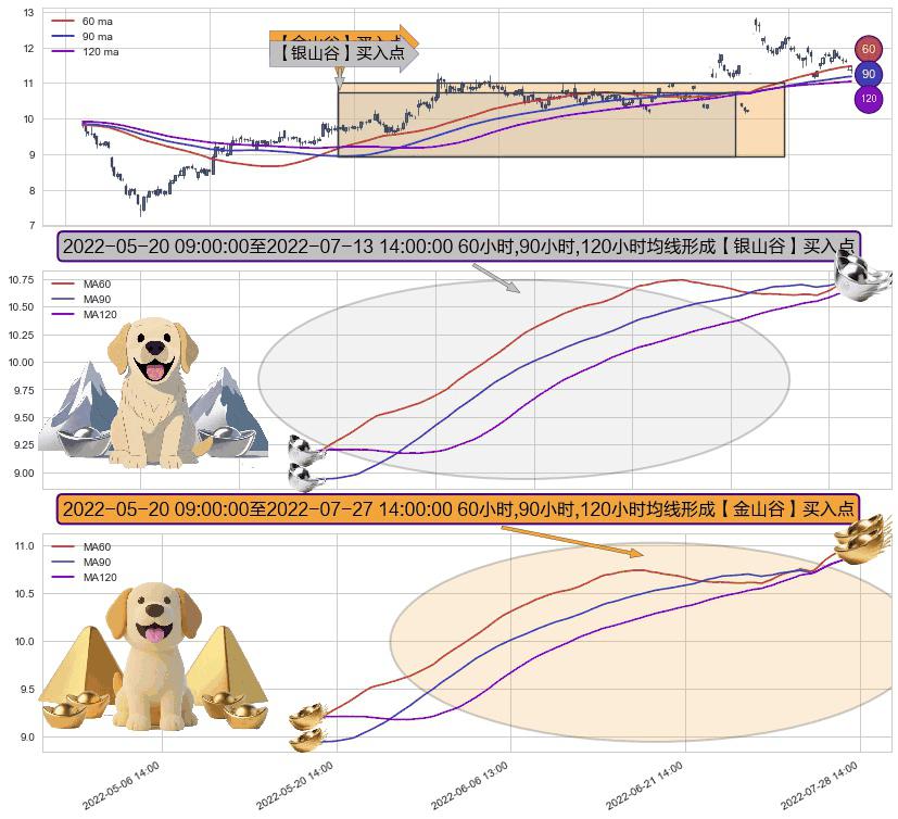 ⚀ 2022-05-20 10:00:00-小时至2022-07-27 14:00:00-小时显现 60小时-90小时-120小时均线 【金山谷】买入点 其再次确认了买入信号,可靠性更强,买入