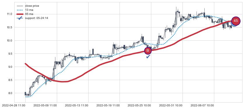 ⚂ 2022-06-30 14:00:00小时突然冒出一根大阳线,一下子顶穿三条均线且收盘价收在各条均线之上
