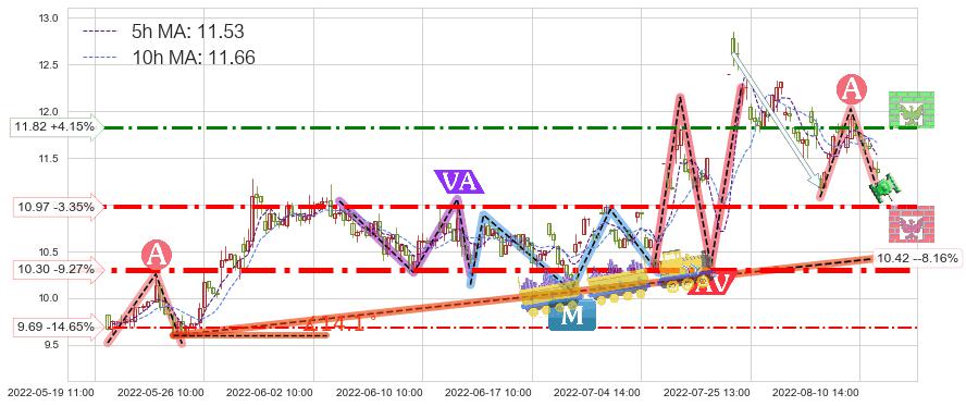 ♘ 支撑价格位10.97,可信任强度84.60%,距离最后交易2022-08-12 14:00形成的收盘价格11.35相差 -3.35%
