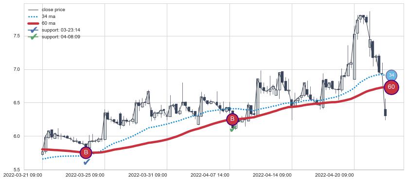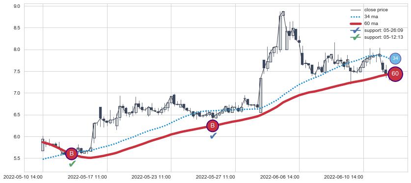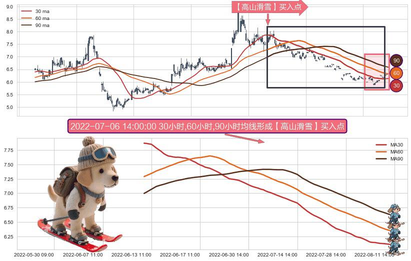⚀ 2022-06-10 14:00:00小时-2022-08-10 14:00:00小时显现 30小时-60小时-90小时均线 【高山滑雪】买入点 看多信号,后市看涨,买入