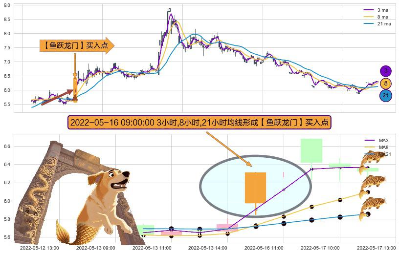 ⚀ 2022-05-16 09:00:00小时显现 3小时-8小时-21小时均线 【鱼跃龙门】买入点 看多信号,后市看涨,买入
