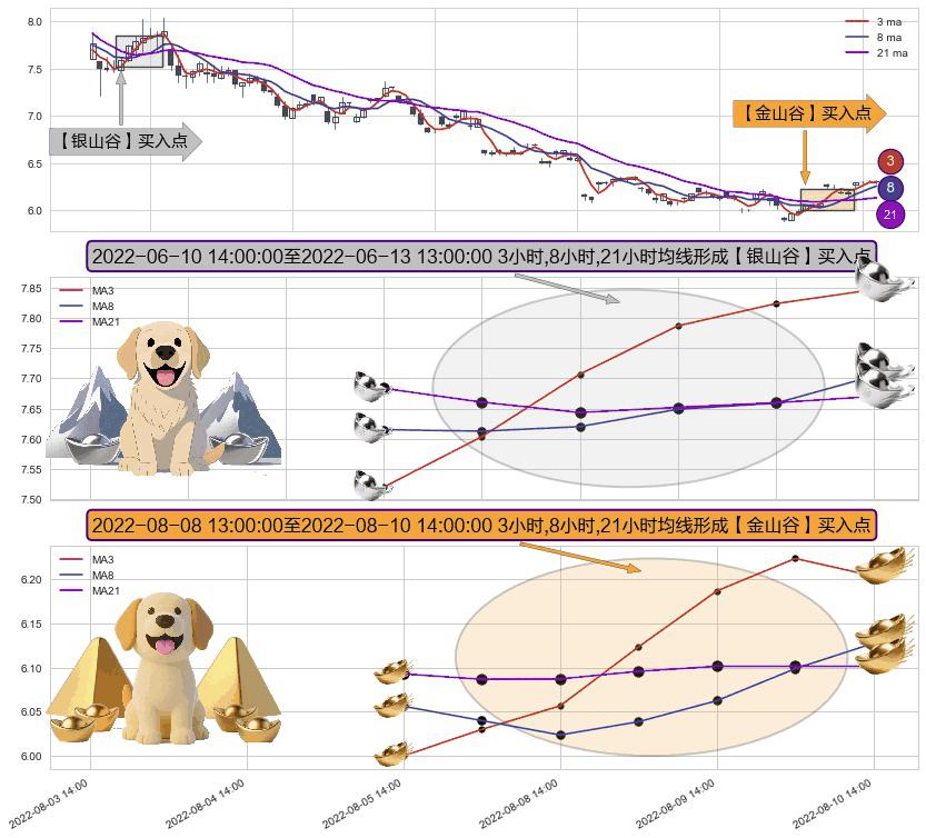 ⚀ 2022-08-08 14:00:00-小时至2022-08-10 14:00:00-小时显现 3小时-8小时-21小时均线 【金山谷】买入点 其再次确认了买入信号,可靠性更强,买入