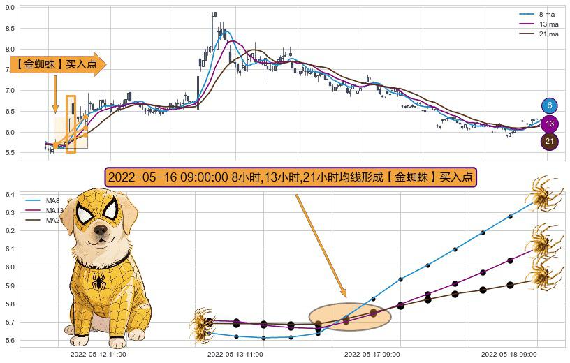 ⚀ 2022-05-16 09:00:00小时显现 8小时-13小时-21小时均线 【金蜘蛛】买入点 看多信号,后市看涨,买入