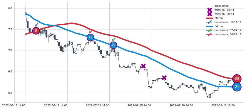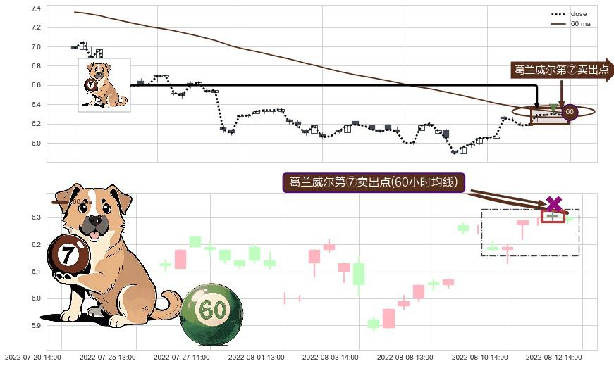 ⚀ 2022-08-12 13:00:00-小时显现 葛兰威尔均线 60小时均线 第⑦卖出点 下降趋势的中继信号,后市看跌,卖出信号