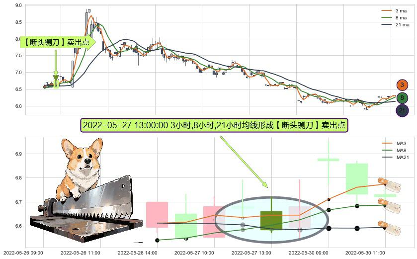 ⚀ 2022-05-27 13:00:00小时显现 3小时-8小时-21小时均线 【断头铡刀】卖出点 看空信号,后市看跌,卖出