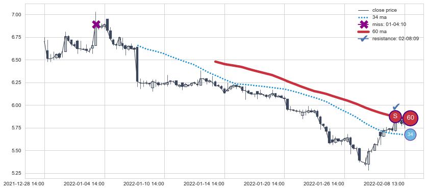 ⚄ 价格在均线遇到阻力后再次向下回落了【极短】距离, 第⑦卖出点 阻力效果【等待验证】