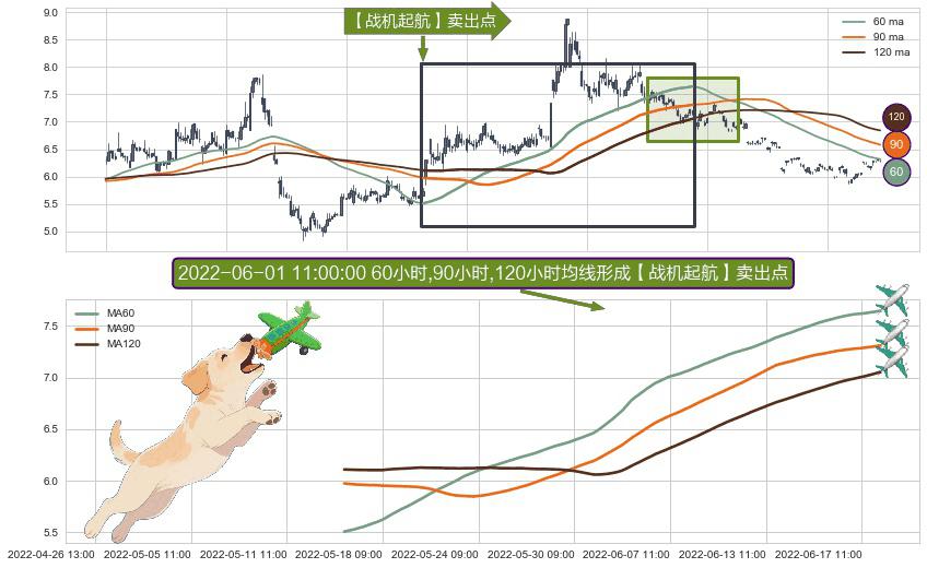 ⚀ 2022-05-13 14:00:00小时-2022-06-20 14:00:00小时显现 60小时-90小时-120小时均线 【战机起航】卖出点 看空信号,后市看跌,卖出