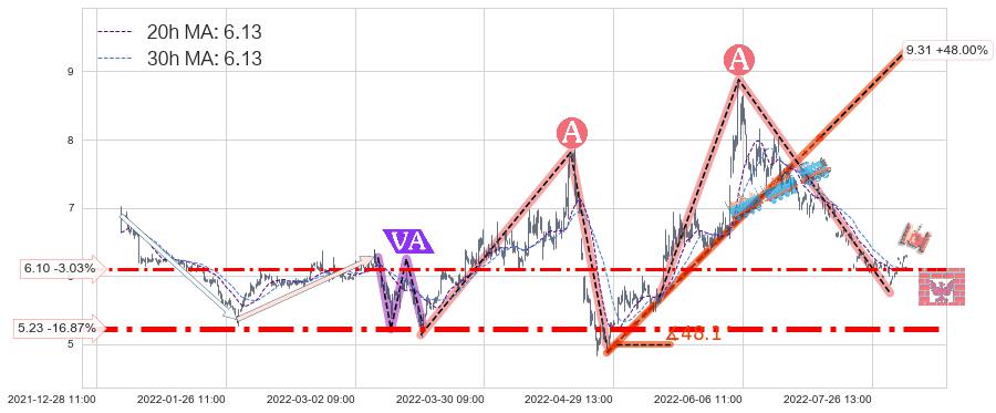 ♘ 支撑价格位5.23,可信任强度85.70%,距离最后交易2022-08-12 14:00形成的收盘价格6.29相差 -16.87%