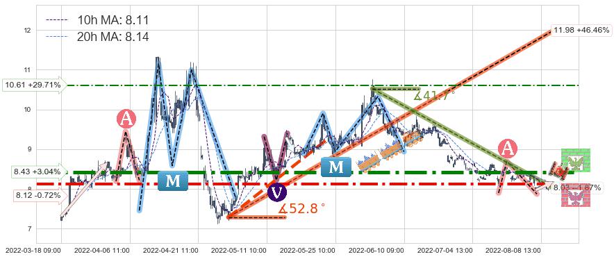 ♞ 10小时均线:8.11,20小时均线:8.14→ 快线<慢线