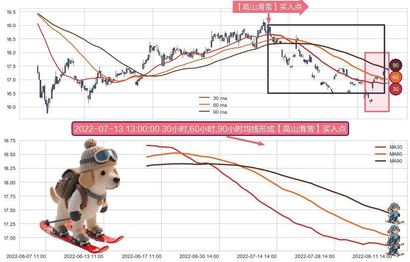 ⚀ 2022-06-16 11:00:00小时-2022-08-11 13:00:00小时显现 30小时-60小时-90小时均线 【高山滑雪】买入点 看多信号,后市看涨,买入
