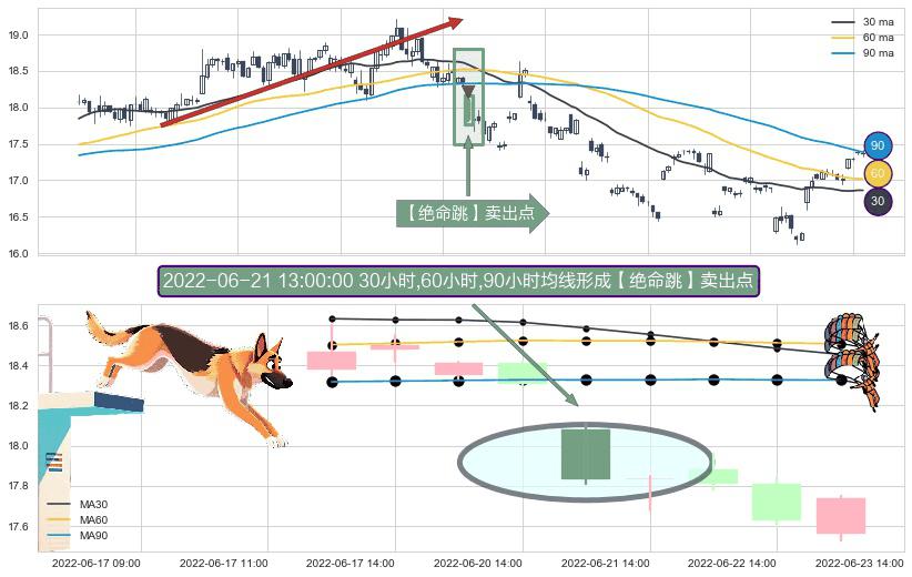 ⚀ 2022-06-21 13:00:00小时显现 30小时-60小时-90小时均线 【绝命跳】卖出点 看空信号,后市看跌,卖出