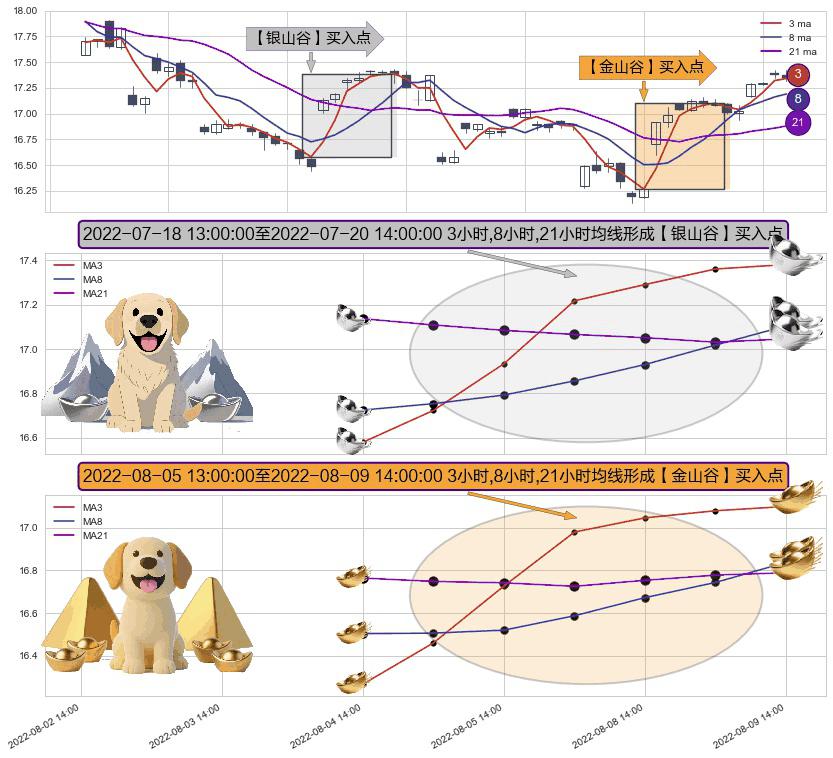 ⚃ 2022-08-05 14:00:00-小时至2022-08-09 14:00:00-小时显现 3小时-8小时-21小时均线 【金山谷】买入点 其再次确认了买入信号,可靠性更强,买入