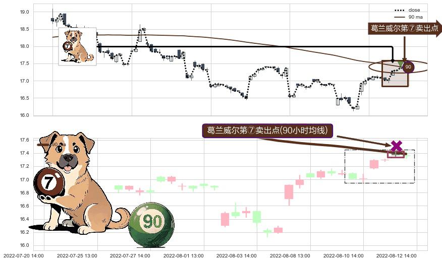 ⚀ 2022-08-12 13:00:00-小时显现 葛兰威尔均线 90小时均线 第⑦卖出点 下降趋势的中继信号,后市看跌,卖出信号