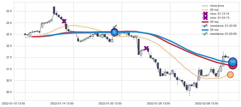 ⚄ 均线向上突破后价格上探力度高,正乖离率高,再次向下破位后维持原均线下跌趋势【弱】