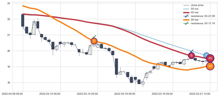 ⚀ 卖点向下突破均线后,价格走势有持续向下的迹象,但动能稍显不足,迟迟不能远离均线