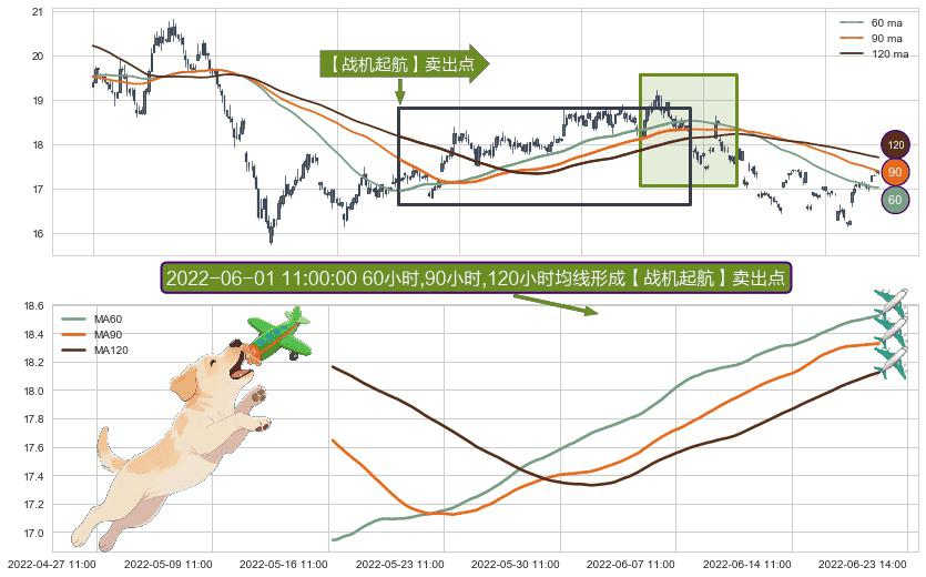 ⚀ 2022-05-16 13:00:00小时-2022-06-20 14:00:00小时显现 60小时-90小时-120小时均线 【战机起航】卖出点 看空信号,后市看跌,卖出
