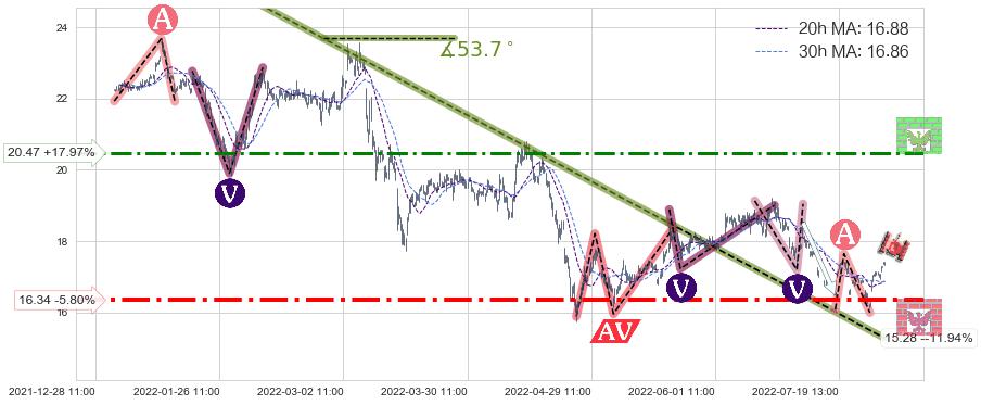 ♘ 阻力价格位20.47,可信任强度62.79%,距离最后交易2022-08-12 14:00形成的收盘价格17.35相差 +17.97%