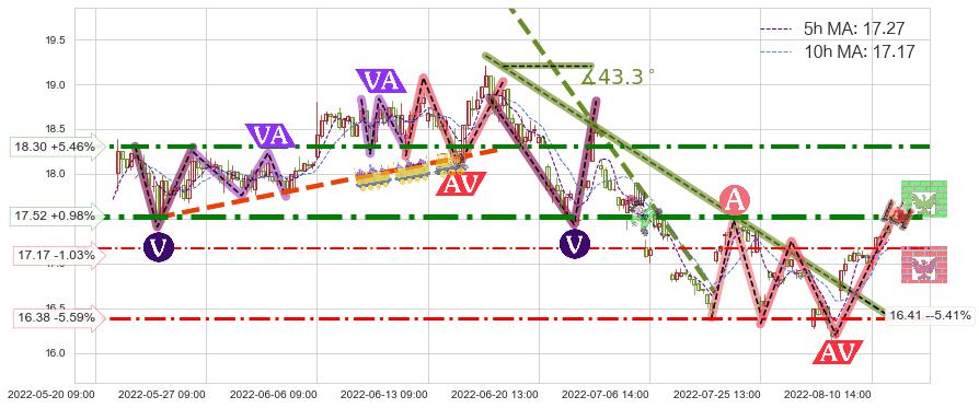 ♘ 阻力价格位17.52,可信任强度90.74%,距离最后交易2022-08-12 14:00形成的收盘价格17.35相差 +0.98%