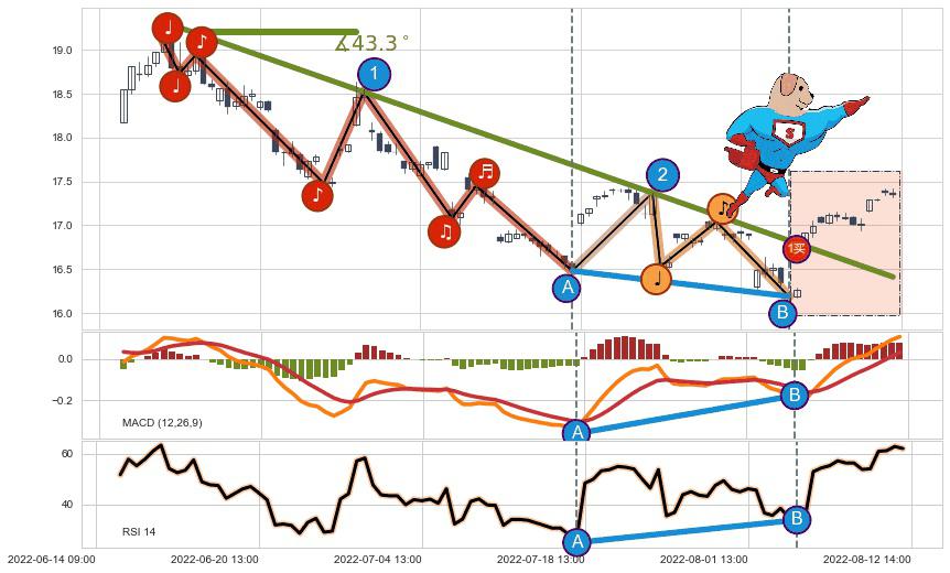 ➣ 2022-06-15 13:00-2022-08-05 13:00下跌趋势存在反转上涨[机会],其原下跌趋势的阻力位(16.41)已被突破[强支撑信号],原下跌趋势角度: 43.3˚