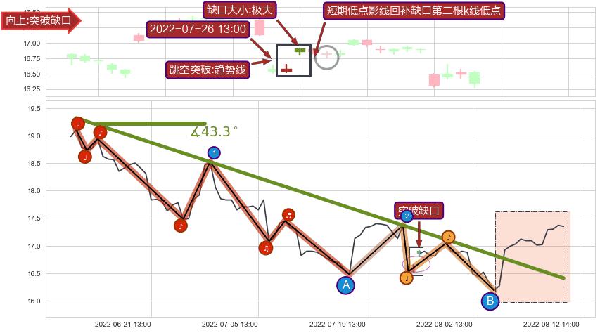 从2022-06-15 13:00至2022-08-05 13:00,共包含81个小时,阶段股价下跌-11.39%,阶段股价变动位移路程比: 1 : 6,下跌趋势角度: 43.3,2022-07-25 13:00向↘︎形成缺口,跳空下跌-4.84%˚