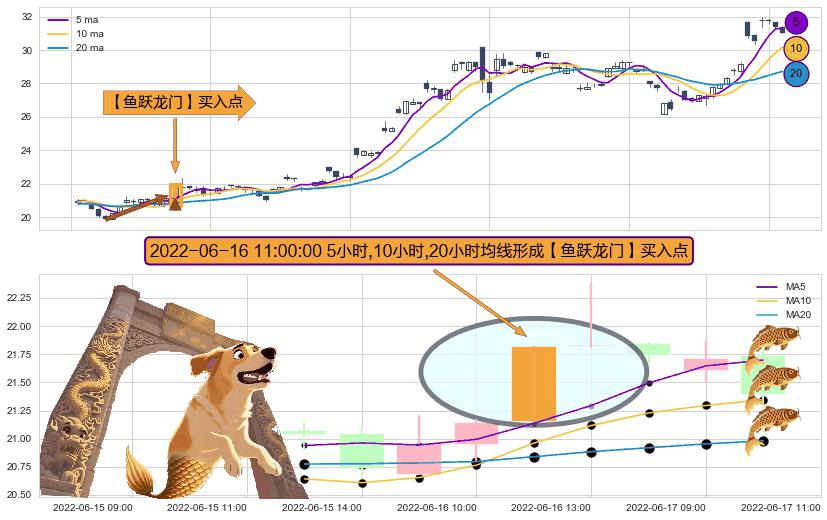 ⚀ 2022-06-16 11:00:00小时显现 5小时-10小时-20小时均线 【鱼跃龙门】买入点 看多信号,后市看涨,买入