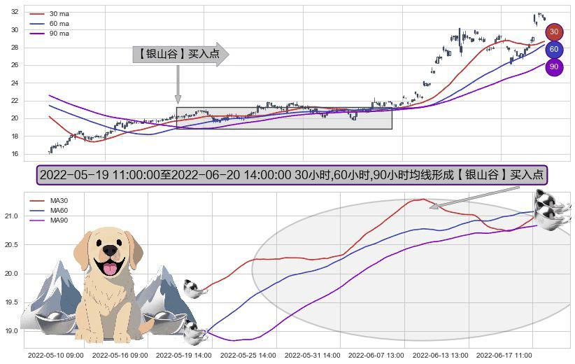 ⚀ 2022-05-19 13:00:00-小时至2022-06-20 14:00:00-小时显现 30小时-60小时-90小时均线 【银山谷】买入点 看多信号,后市看涨,买入