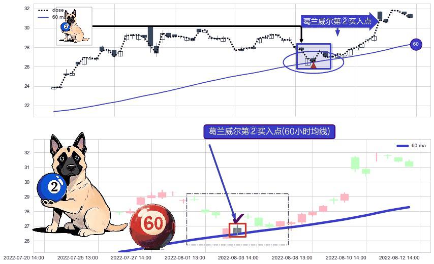 ⚀ 2022-08-02 14:00:00-小时显现 葛兰威尔均线 60小时均线 第②买入点 上升趋势的中继信号,后市看涨,买进信号