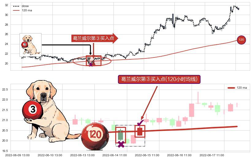 ⚀ 2022-06-14 14:00:00-小时显现 葛兰威尔均线 120小时均线 第③买入点 上升趋势的中继信号,后市看涨,买进信号