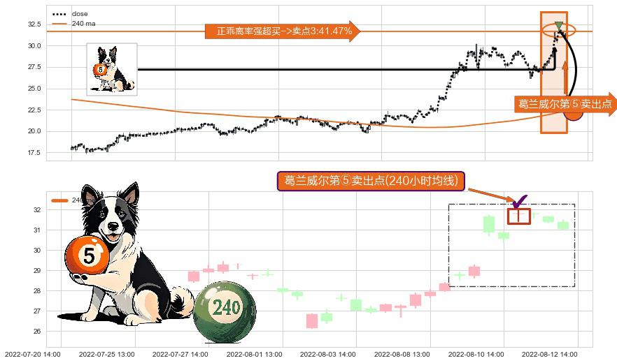 ⚀ 2022-08-11 13:00:00-小时显现 葛兰威尔均线 240小时均线 第⑤卖出点 上升趋势均值回复的短线回落信号,后市看跌,卖出信号