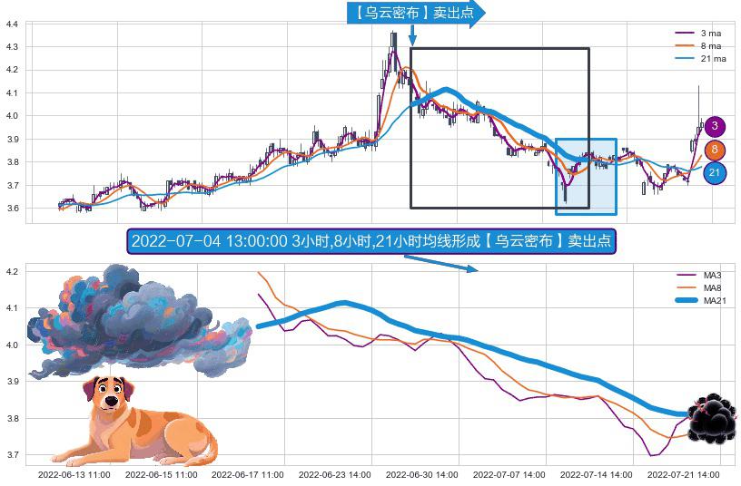 ⚀ 2022-06-16 14:00:00小时-2022-07-20 14:00:00小时显现 3小时-8小时-21小时均线 【乌云密布】卖出点 看空信号,后市看跌,卖出